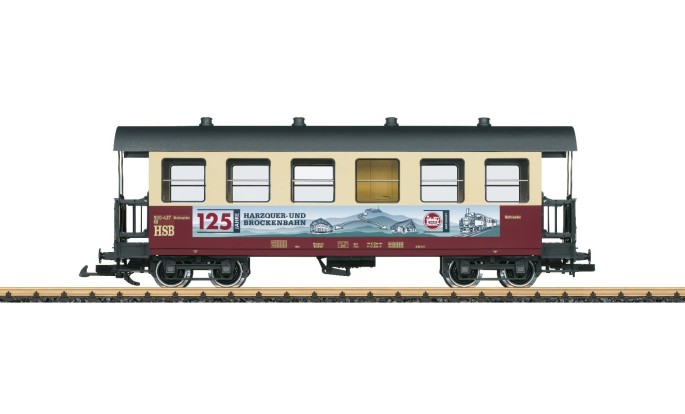 LGB hat einen Personenwagen der HSB mit einer Sonderbeklebung zum Jubiläum versehen und gratuliert so der Meterspurbahn zum Brocken zum diesjährigen Jubiläum.